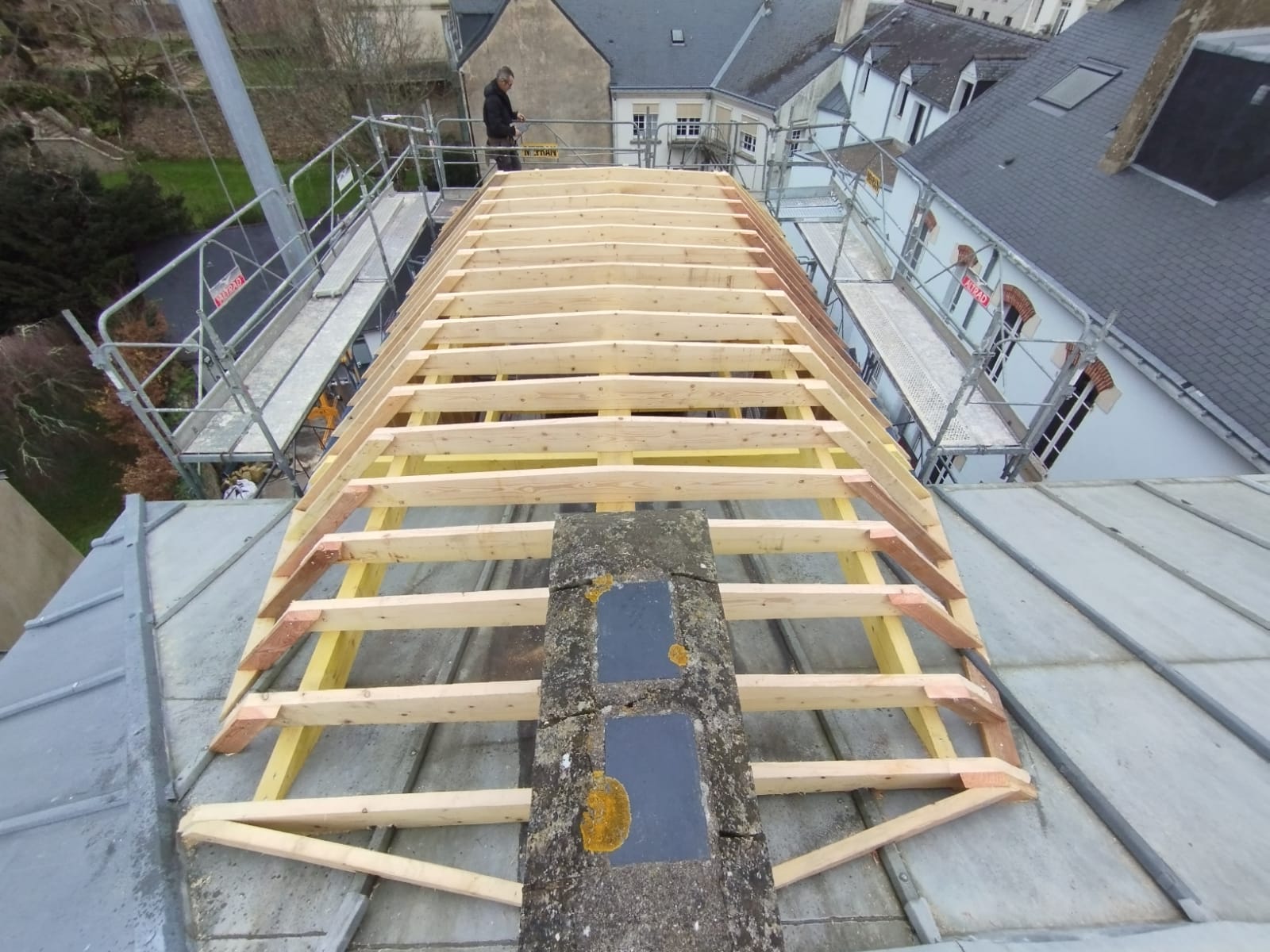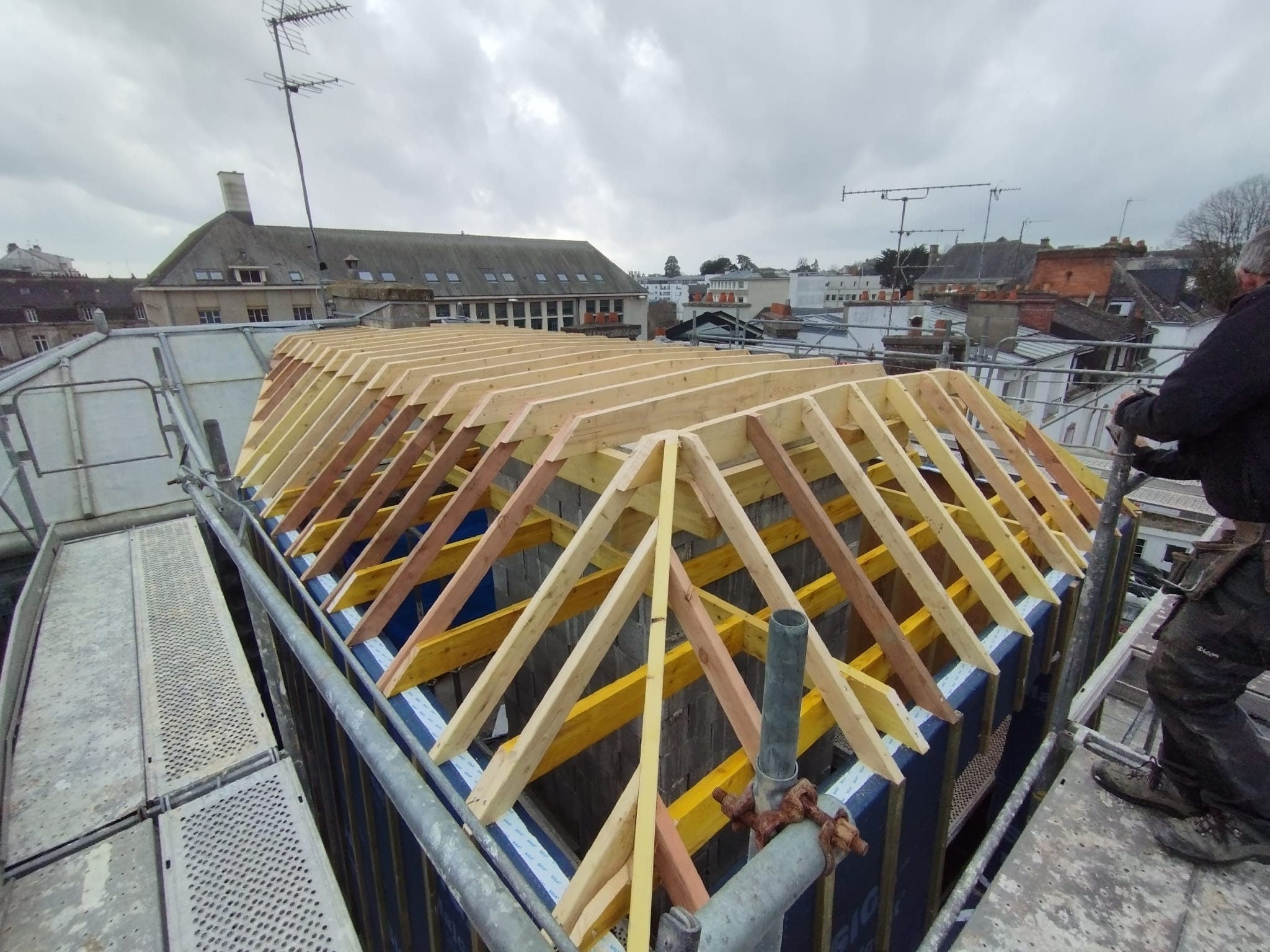 Surélévation ossature bois et charpente traditionnelle mansardée sur les toits de Vannes