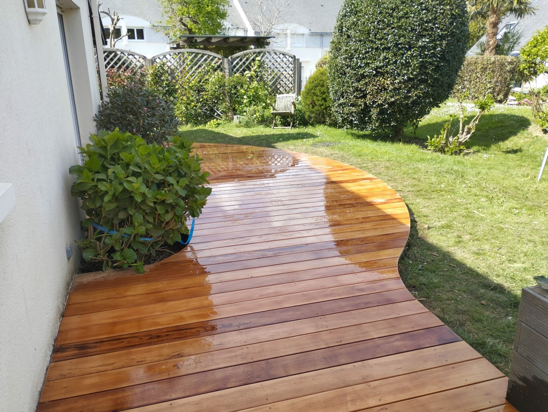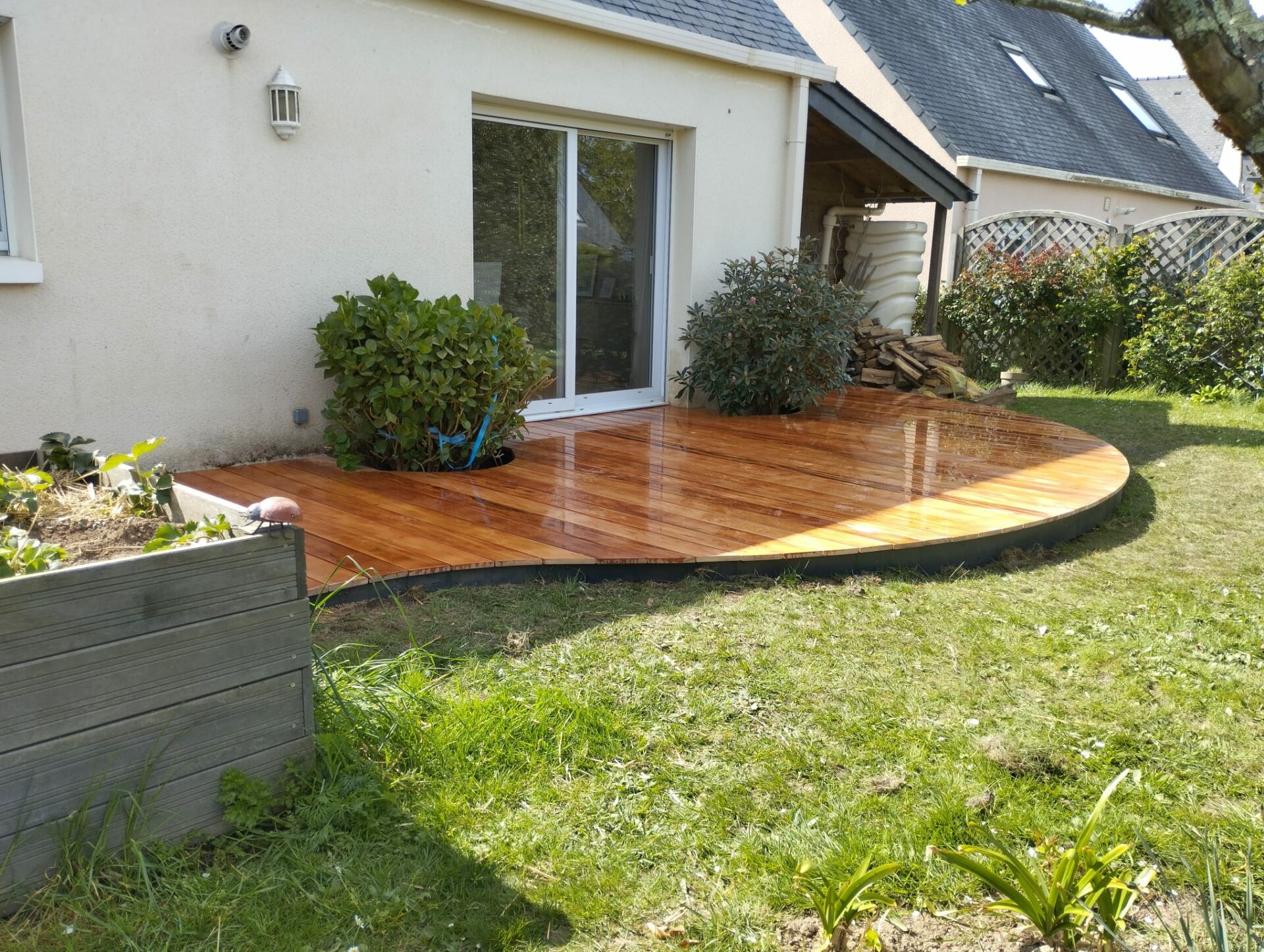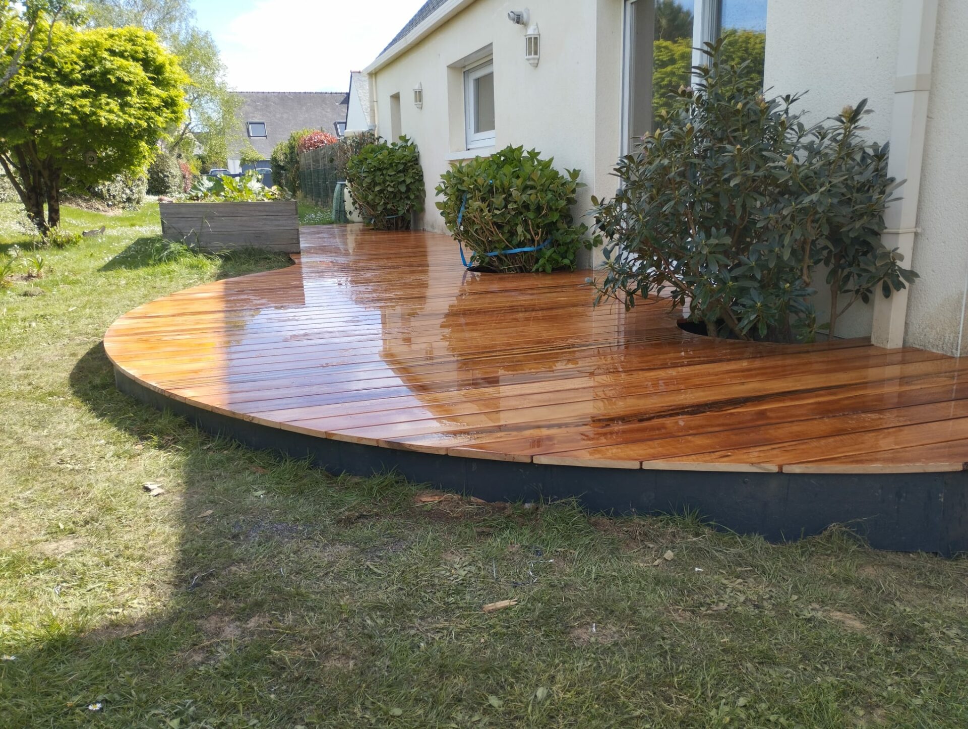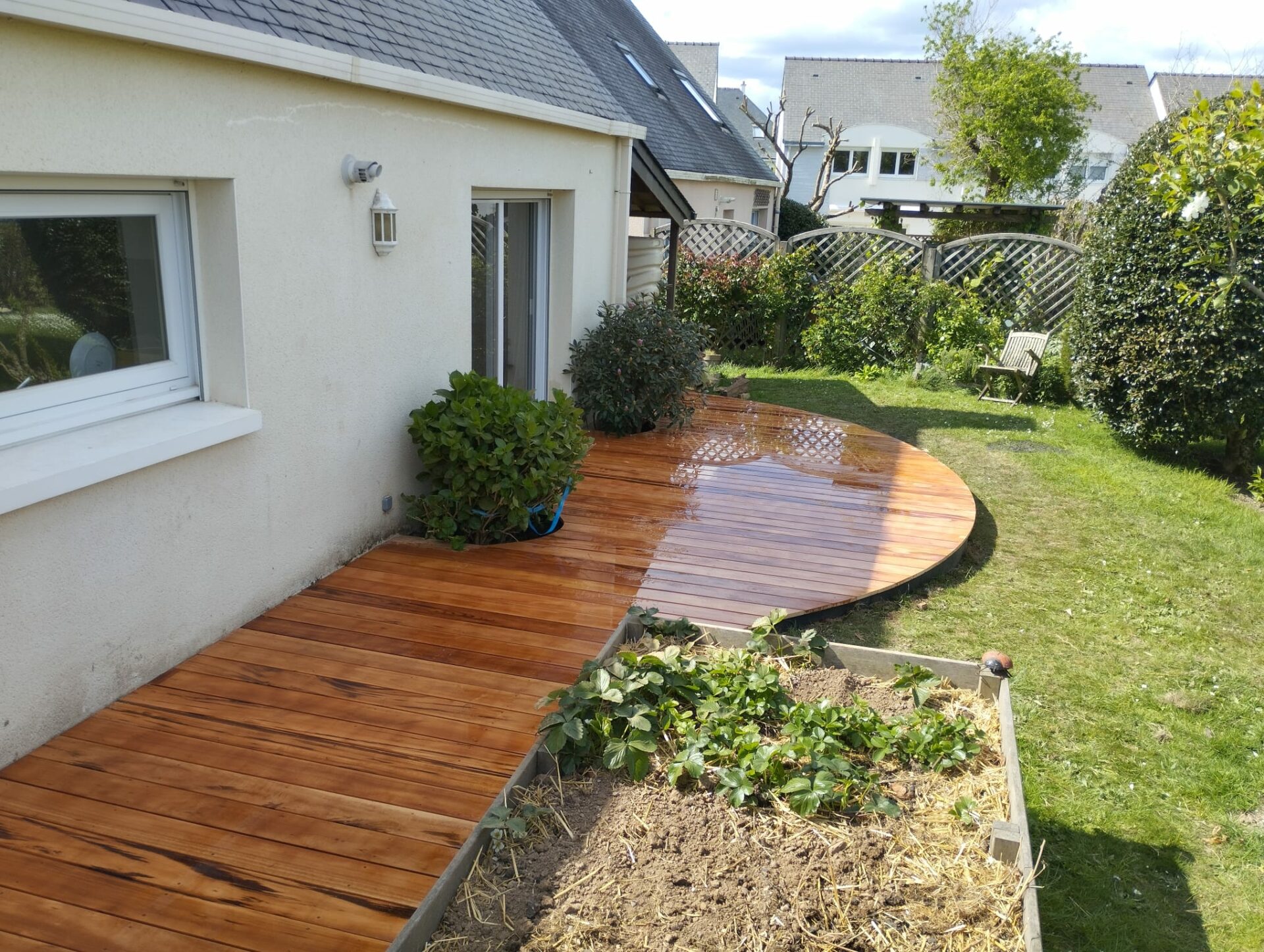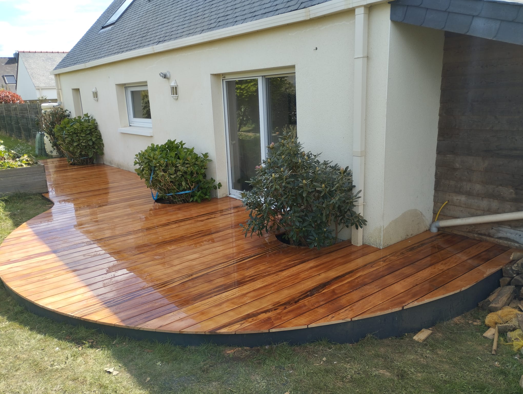 Cette terrasse en bois Ipé à forme atypique allie robustesse, durabilité et design sur mesure. Pensée pour optimiser l’espace et l’esthétisme, elle crée un lieu extérieur unique, convivial et moderne, parfaitement intégré à l’habitation.