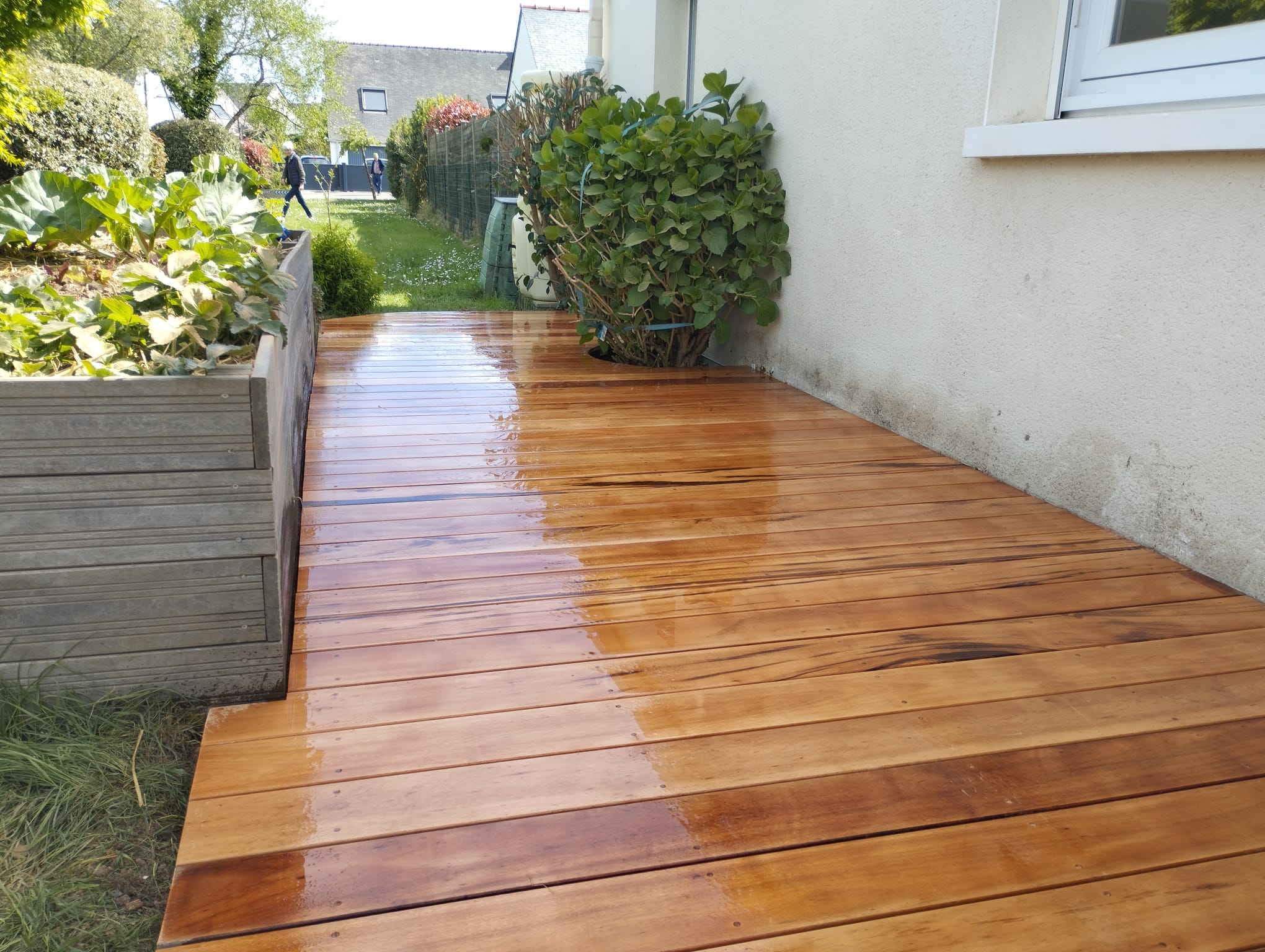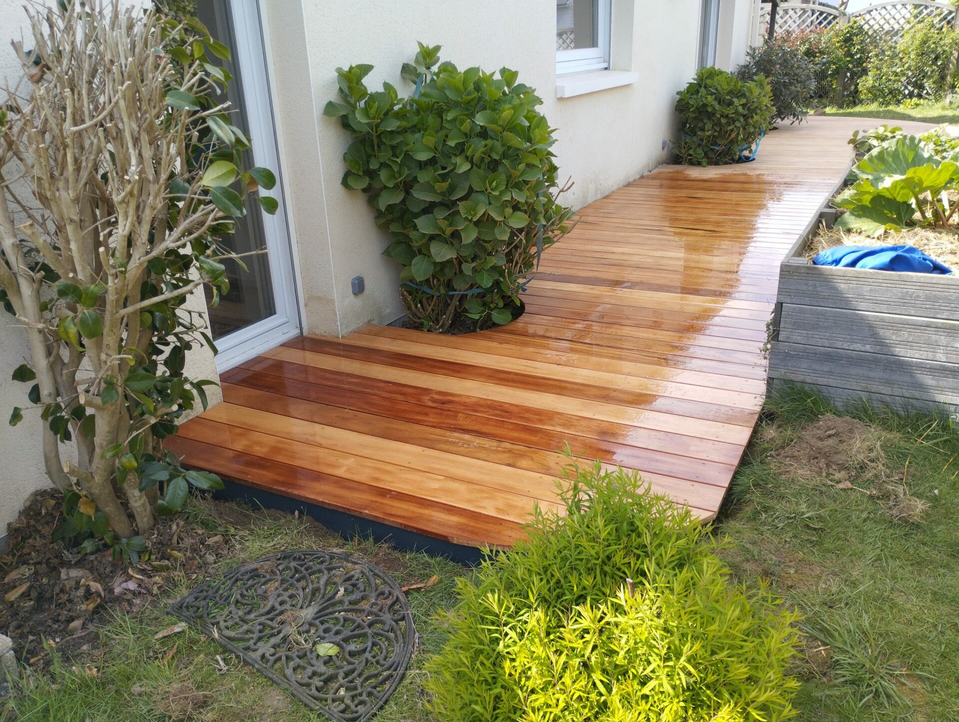 Nous avons réalisé une terrasse en bois Muiracatiara, un bois exotique reconnu pour sa robustesse, sa durabilité et sa teinte chaleureuse, montée sur plots pour une pose parfaitement nivelée. Ce système garantit une excellente stabilité tout en facilitant le drainage et l’entretien de la terrasse.